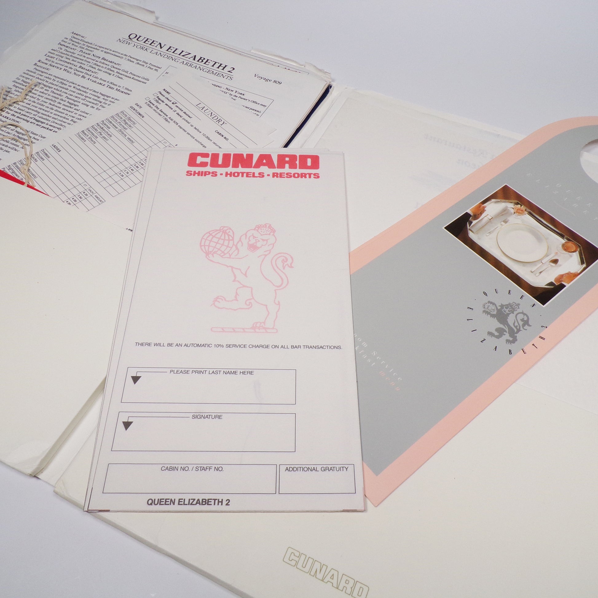 ORIGINAL DOCUMENTS. Octavo (31 x 23cm). Bi fold folder with two pockets containing a wealth of documents for Voyage 809 aboard the luxury liner the Queen Elizabeth 2 in September 1991. Documents include menus, entertainment schedules, order sheets for breakfast etc.