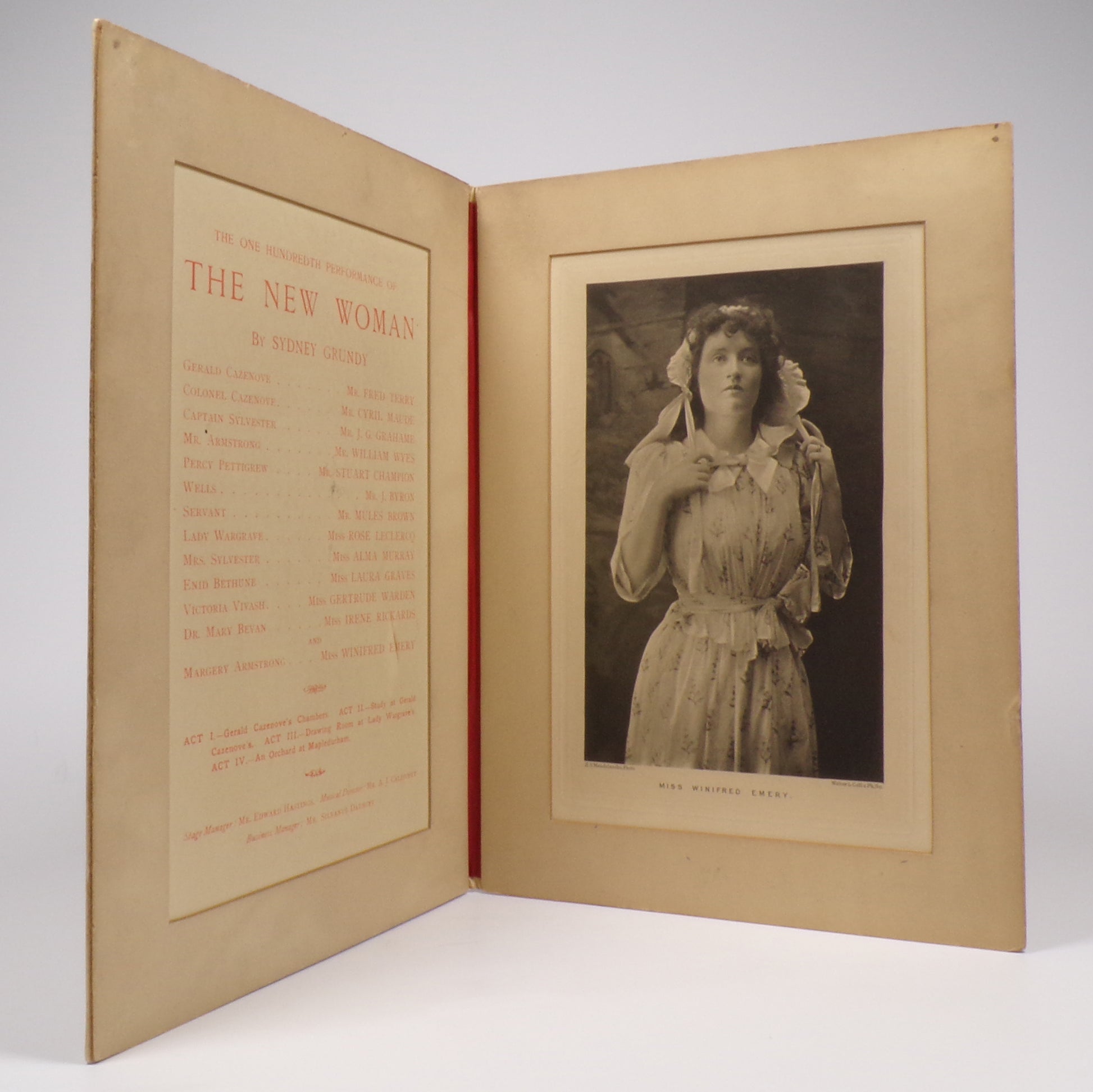 SOUVENIR PROGRAMME. Octavo (23 x 17cm). Bi fold presentation, titles in gilt to upper, mounted print of Miss Winifred Emery facing the cast list.
